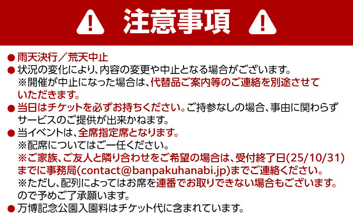 ※ご家族、ご友人と隣り合わせをご希望の場合は、受付終了日(2025/10/31)までに事務局(contact@banpakuhanabi.jp)までご連絡ください。