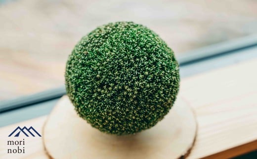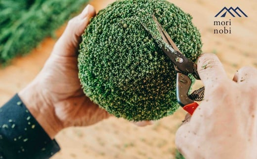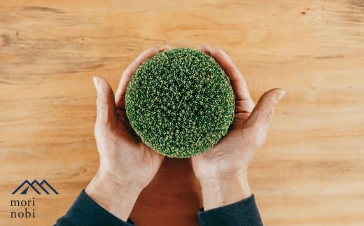杉玉の芯材は、植物由来バイオプラスチック製の森のび独自のフレームを採用。初めてでも無理なく美しく仕上がります。完成した杉玉はお持ち帰りいただき、杉の香りと緑からモスグリーン、茶色へと変化していく自然の色合いをお楽しみいただけます。