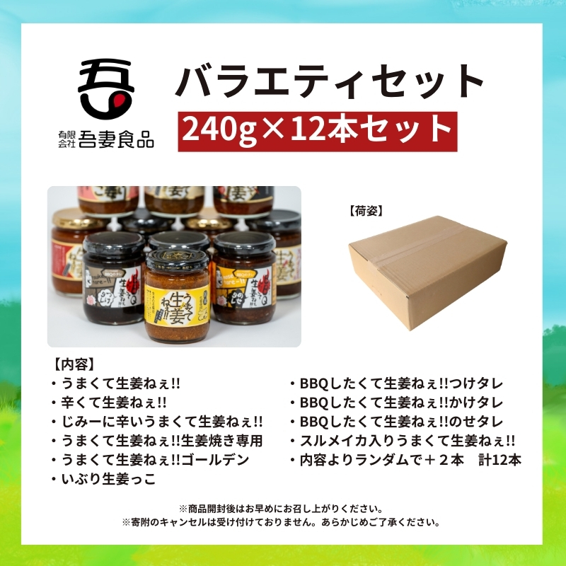うまくて生姜ねぇシリーズバラエティセット(12本セット):うまくて生姜ねぇ!!/辛くて生姜ねぇ!!/うまくて生姜ねぇゴールデン/いぶり生姜っこ/じみーに辛いうまくて生姜ねぇ!!/生姜焼き専用うまくて生姜ねぇ!!BBQしたくて生姜ねぇ!!つけタレ/BBQしたくて生姜ねぇ!!かけタレ/BBQしたくて生姜ねぇ!!のせタレ/スルメイカ入りうまくて生姜ねぇ!! 各1本ずつ)(上記内容から+2本)