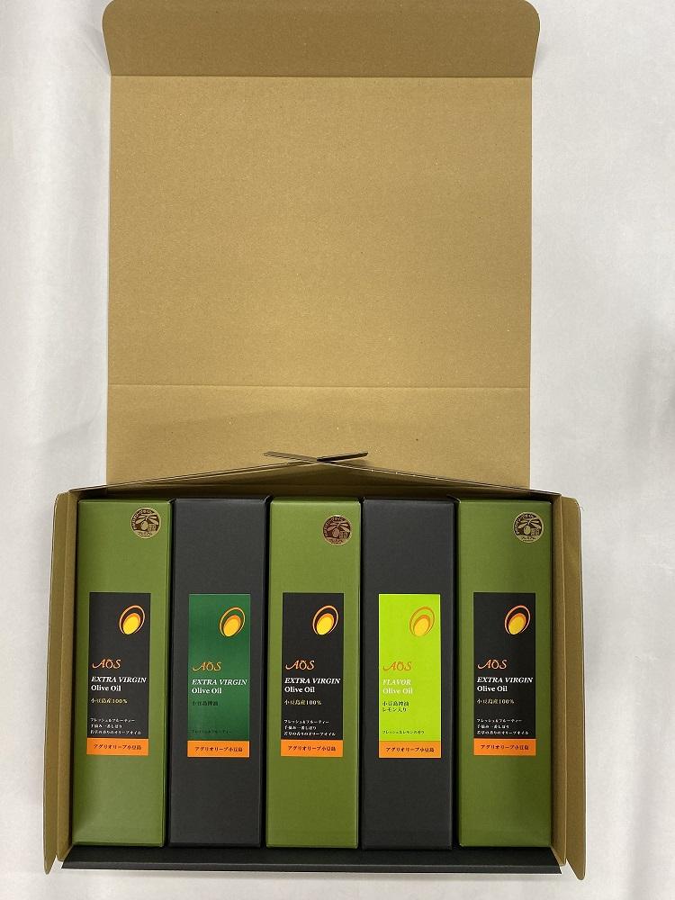 若草の香りがさわやかな小豆島産100%エキストラバージンオリーブオイル182g×3本、スペイン産オリーブを自社工場で採油したエキストラバージンオリーブオイル182g×1本、香川県産レモンの爽やかな味わいのフレーバーオイル182g×1本のセットです。