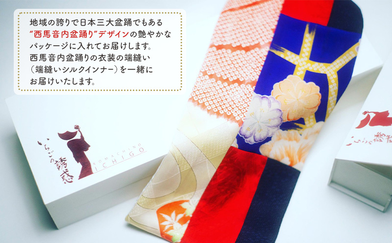日本最大の横手盆地の肥沃な大地、秋田最大の雄物川水系の伏流水によって豊かに育った秋田県羽後町産のいちごです。地域の誇りで日本三大盆踊でもある“西馬音内盆踊り”デザインの艶やかなパッケージに入れてお届けします。
