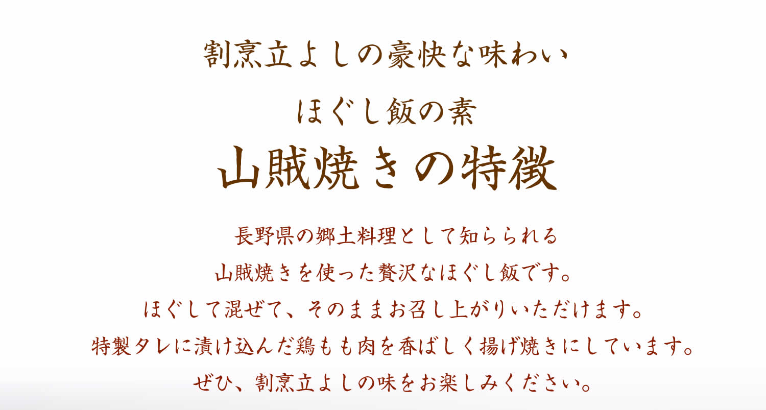 山賊焼は、鶏肉をにんにく醤油ダレに漬け込み豪快に揚げる、長野県松本周辺の名物料理。そのジューシーさと香ばしさをそのまま炊き込みご飯で楽しめるようにしました。