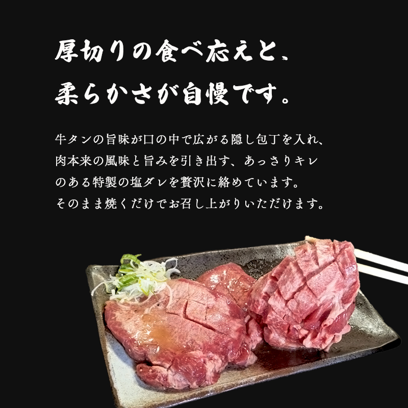 また、特製の塩ダレを絡めておりますので、そのまま焼いてお召し上がりいただけます。厚切りの食べ応えと柔らかさを是非ご賞味ください。