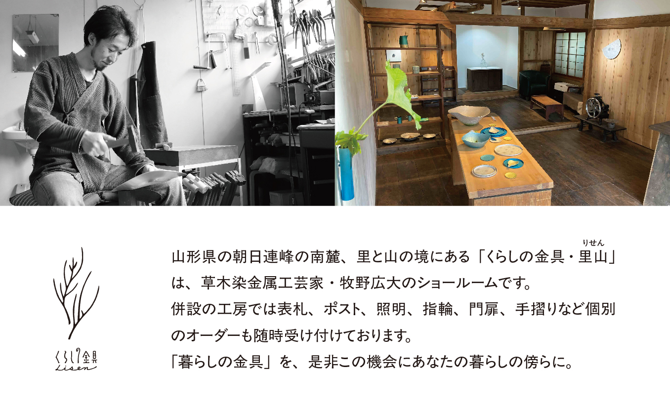 山奥の古民家を工房にし、併設するショールームで金属を用いた様々な暮らしのアイテムを提案しています。
