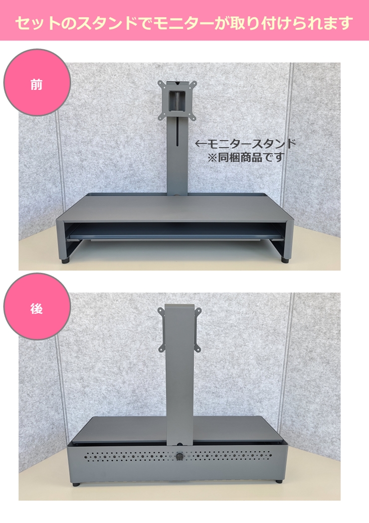 本商品セットのモニタースタンドと組み合わせてモニターを取り付けられるので、作業スペースが更に広がります。