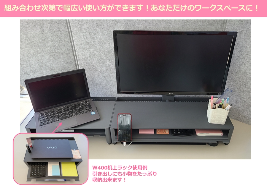 机の上を整理して作業スペースの拡充と作業の効率化が図れます。