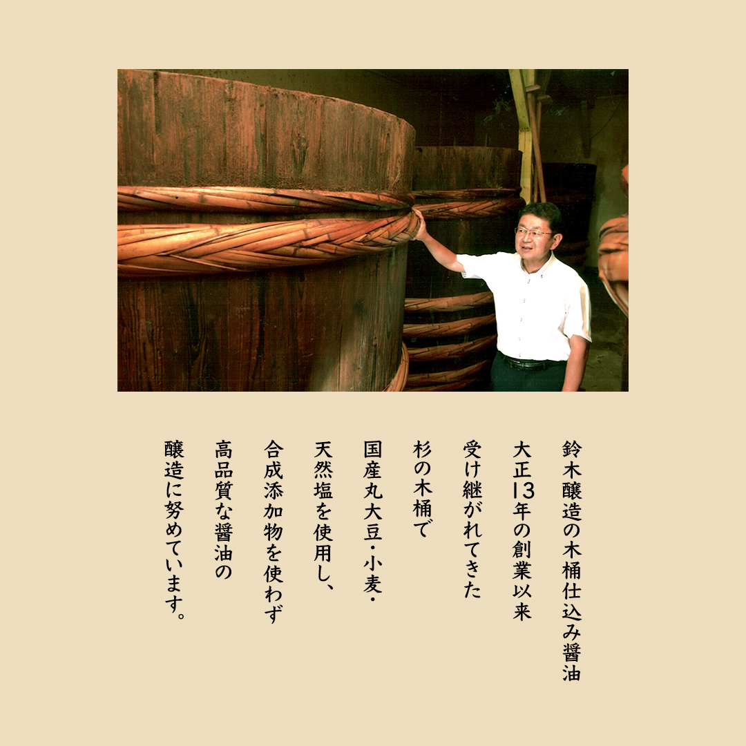 木桶仕込みの醤油は流通量の1パーセントと大変貴重です。木桶にてじっくり時間をかけ発酵、熟成させてた芳醇をこれからも伝承してまいります。