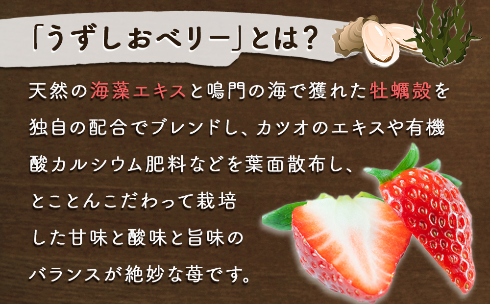 天然の海藻エキスと鳴門産のカキ殻(有機酸カルシウム肥料)を独自の配合でブレンドし、散布して育てられた安全・安心のこだわりイチゴです。