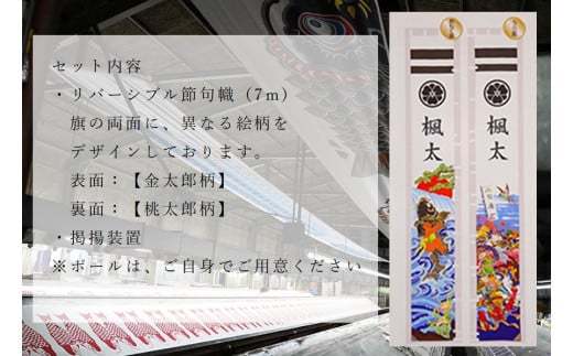 ・金太郎リバーシブル節句幟(7m)表面:金太郎柄 裏面:桃太郎柄