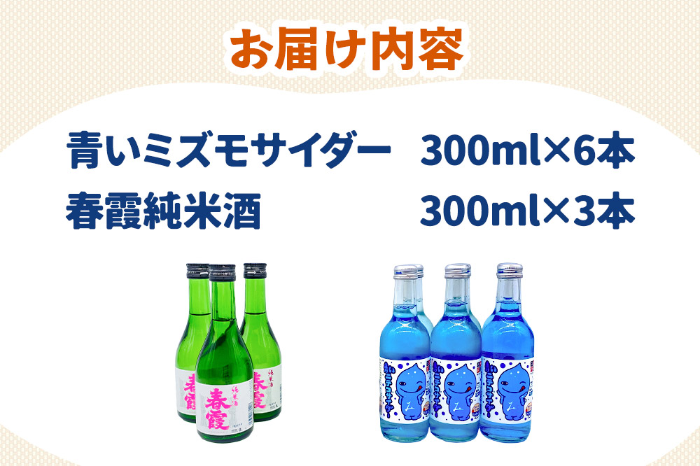 ■名称:青いミズモサイダー6本と春霞純米酒3本のセット