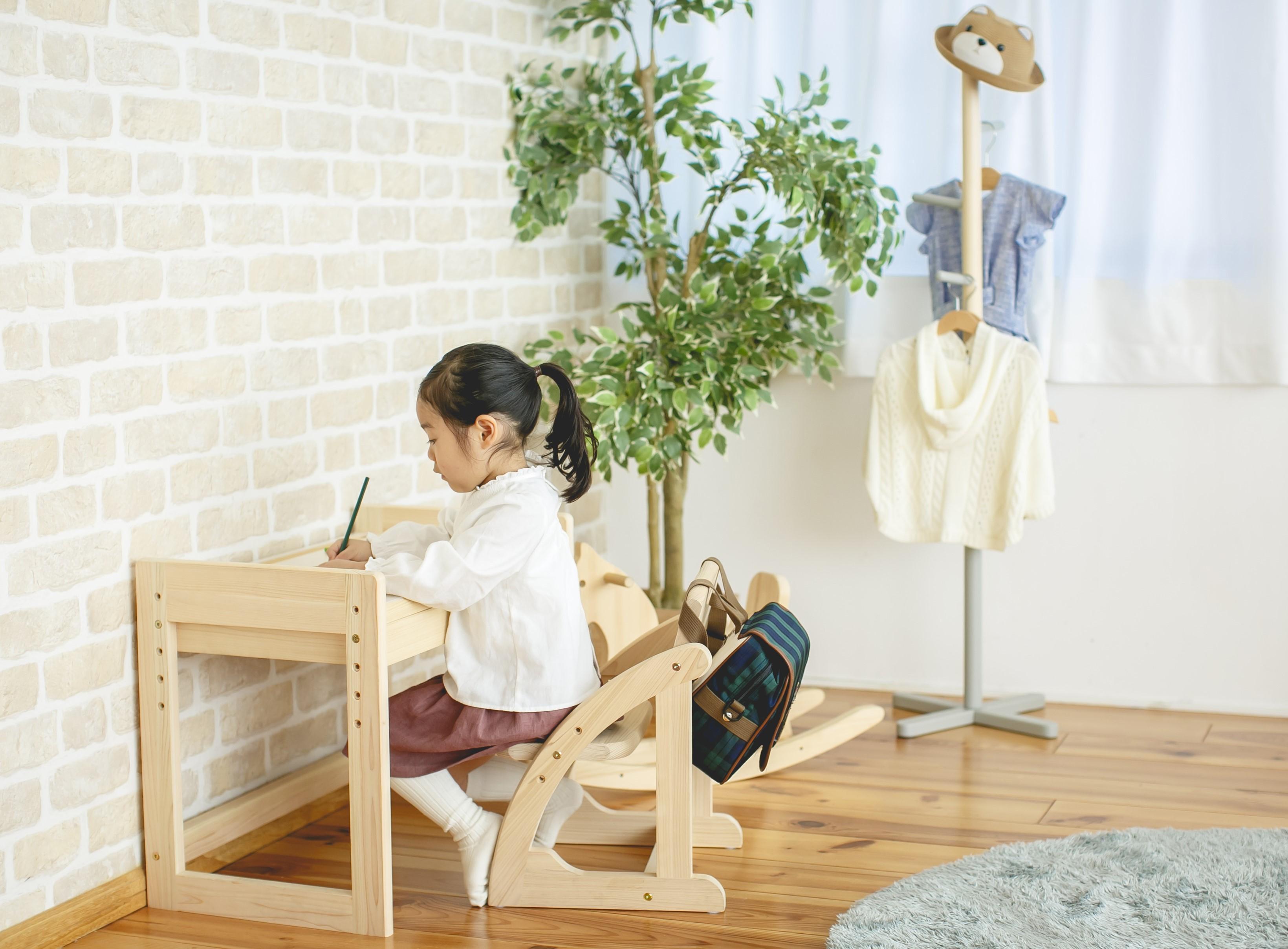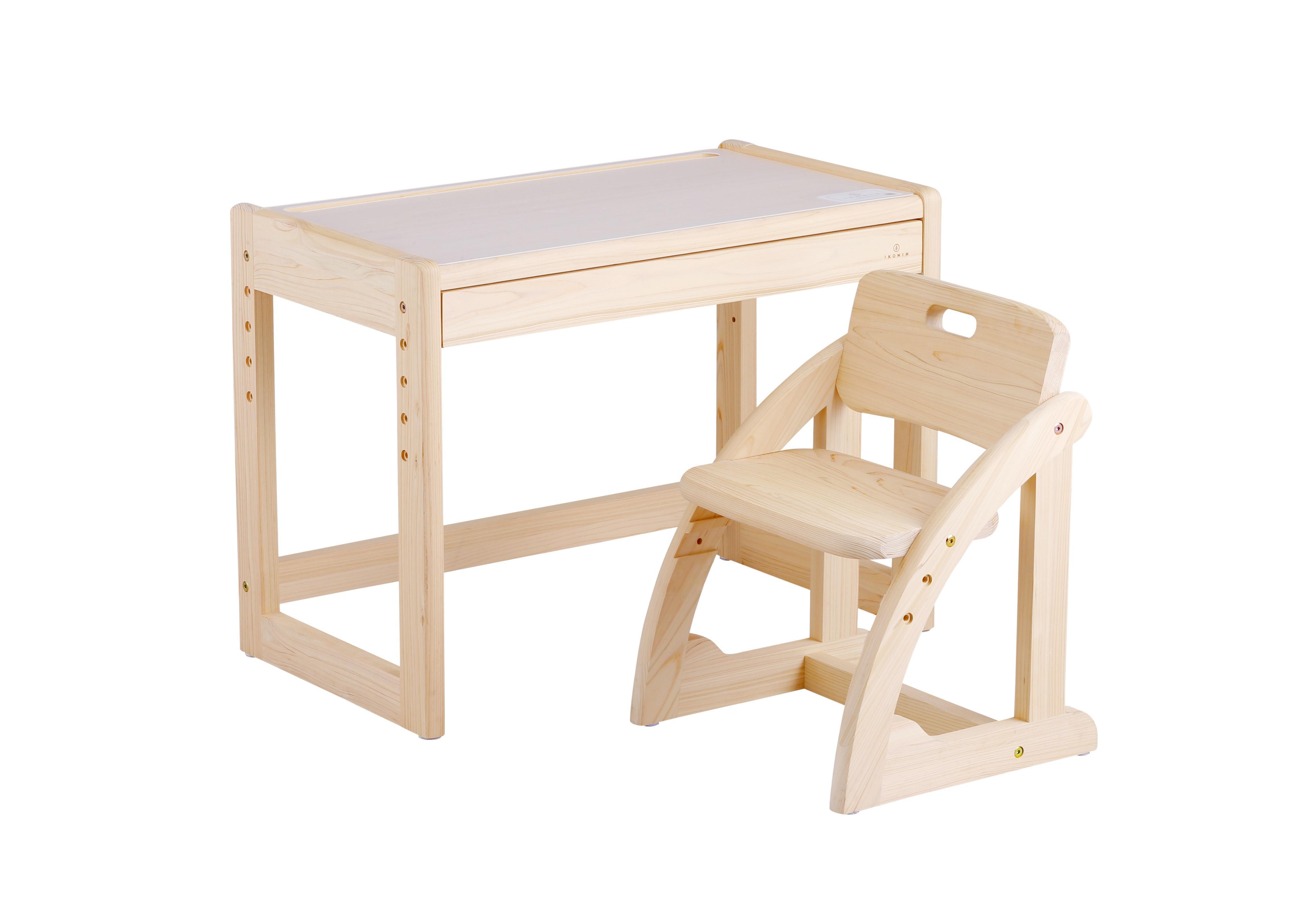 お子さまの成長に合わせて高さを調節できる総ひのきのキッズデスクとキッズチェアのセットです。