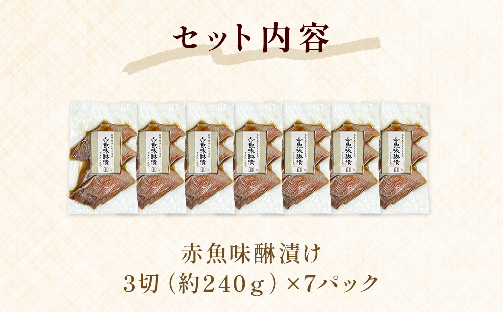 赤魚味醂漬け 3切(約240g)×7パック 【原材料】 赤魚(アイスランド産又はカナダ産) 油 醗酵調味料 砂糖 (一部に小麦、大豆を含む)