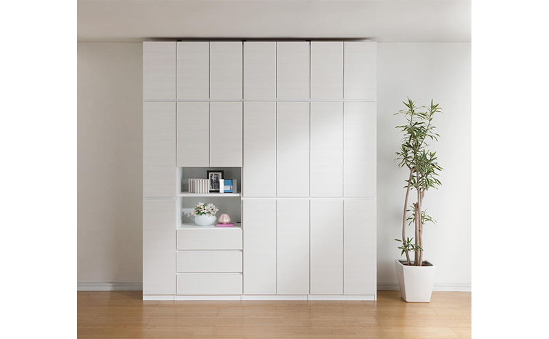 壁面リビングキャビネット、ポルターレシリーズで連結すれば天井まで使える大容量壁面収納となります。