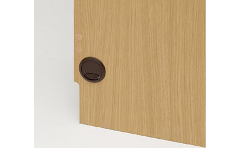 静かな開閉の為ダンパー装備、ゆっくり静かに閉まります。巾木よけ、配線用のサイドコード穴も全キャビネットに標準装備。