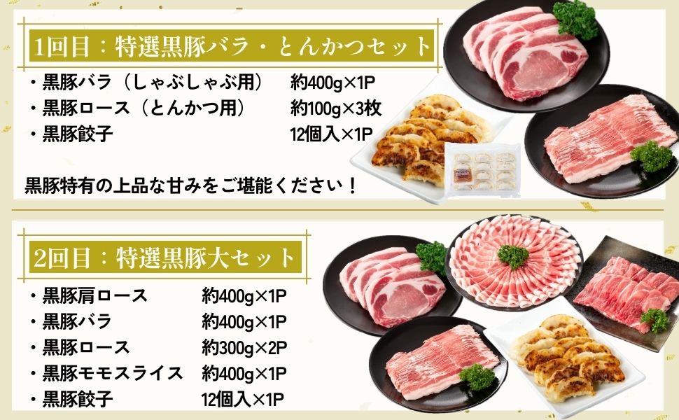 【2回目】 「特選黒豚大セット」:黒豚バラ(しゃぶしゃぶ用)約400g、黒豚肩ロース(しゃぶしゃぶ用)約400g、黒豚ロース(とんかつ用)約300g(3枚入)×2パック、黒豚モモスライス約400g、黒豚餃子(12個入)×1パック