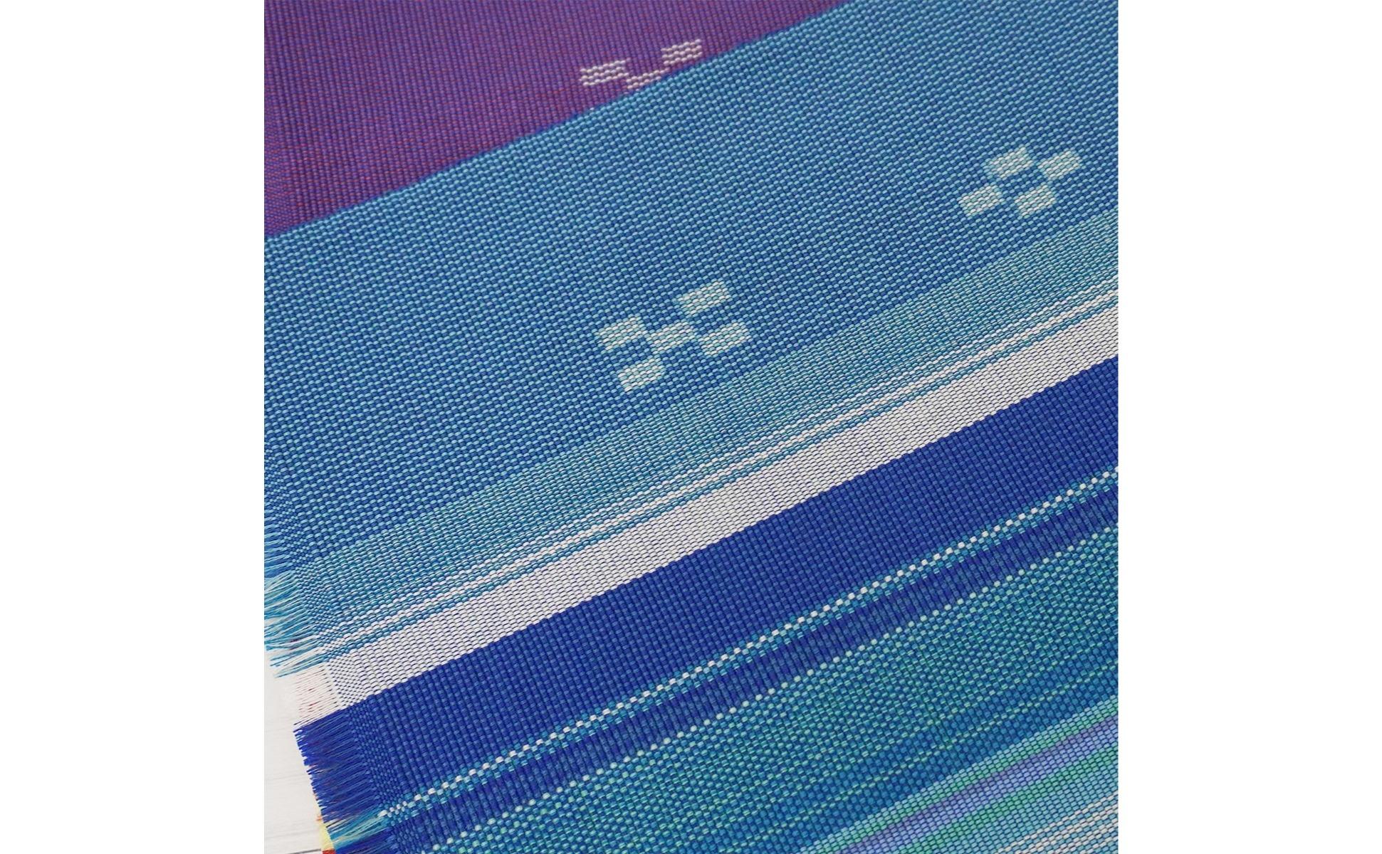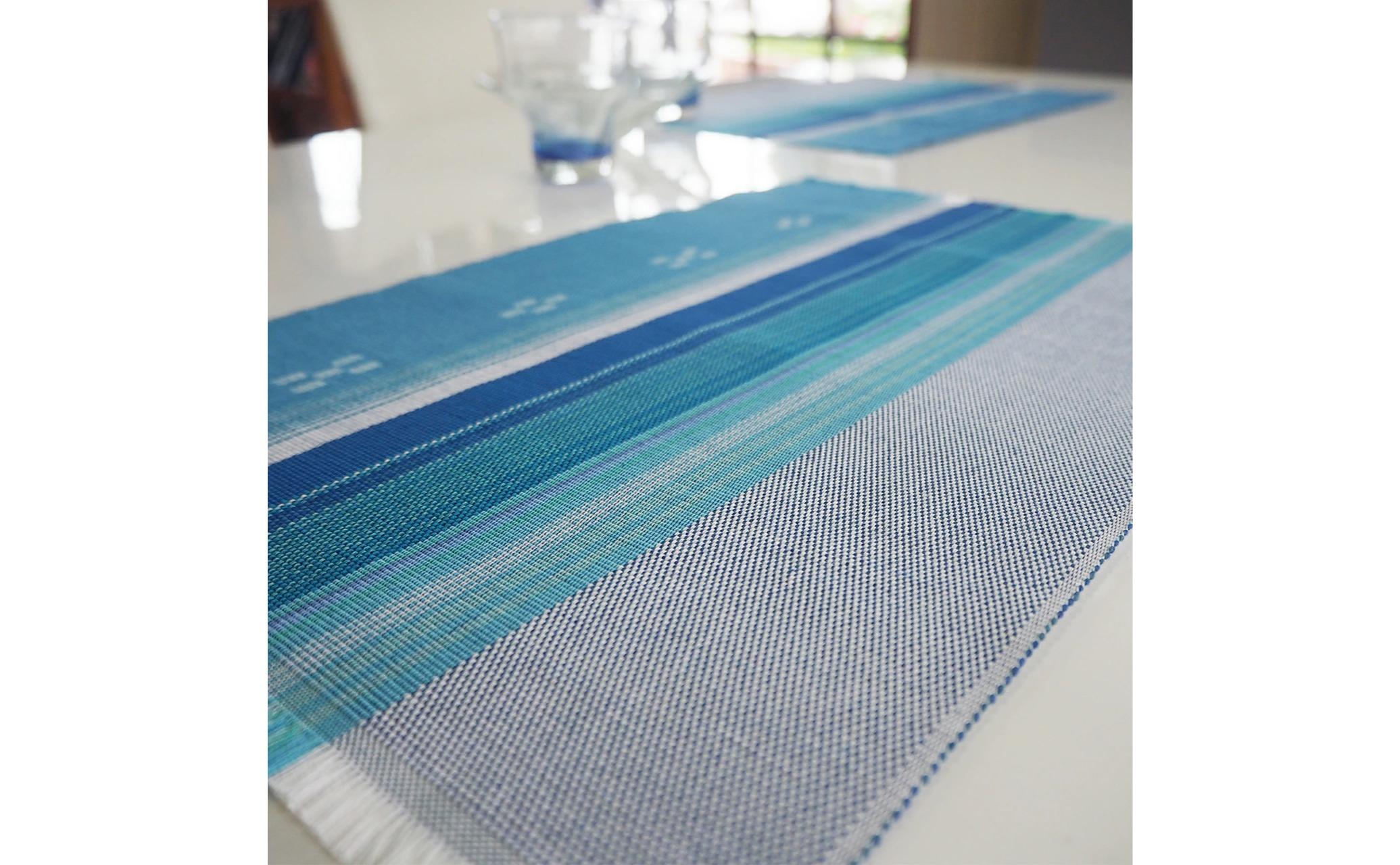 八重山の青く澄んだ海、白く泡立つ波、そして突き抜けるような青空――そんな島の風景をイメージして織り上げた、テキスタイル。その美しさを食卓に添える、プレイスマットとして仕立てました。