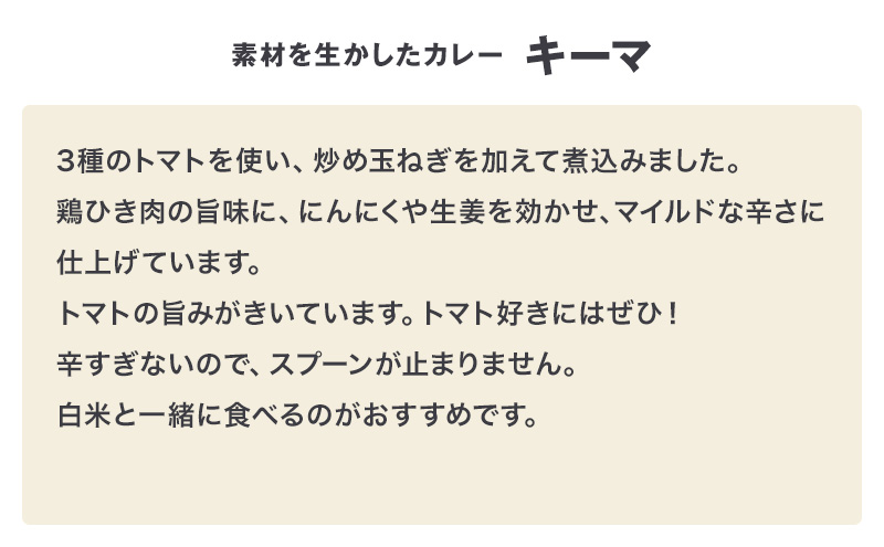 程よいトマトの酸味と、まろやかでコクのある味わいに仕上げた6代目バターチキンカレー、ココナッツミルクの濃厚なコクが特長のプラウンマサラ、にんにくと生姜の風味がきいたキーマカレー、ブラックペッパーと赤唐辛子の辛味が特長のスパイシーチキンカレーと4つの味が楽しめます。