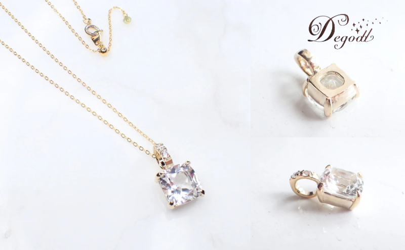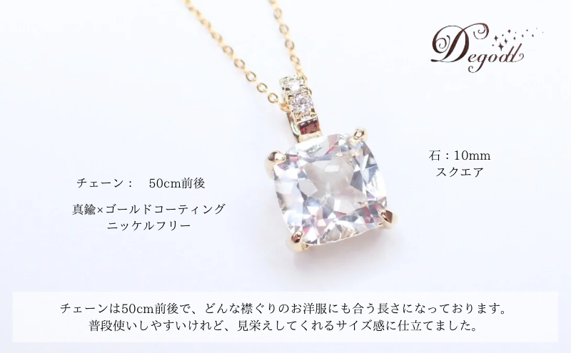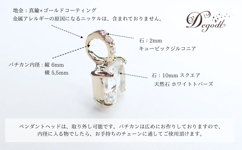 天然石ホワイトトパーズネックレス 1点 内容量:約3g 素材:天然石ホワイトトパーズ10mm×10mm、キュービックジルコニア2mm、真鍮×ゴールドコーティング(ニッケルフリー)、チェーン:真鍮×ゴールドコーティング約50cm、原産地:日本/千葉県