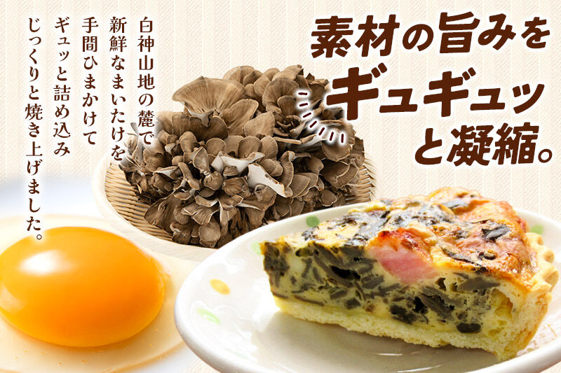 世界自然遺産「白神山地」の麓で新鮮でヘルシーなまいたけを、手間ひまかけてギュッと詰め込み、じっくりと焼き上げました。まいたけの芳香な味わいが口いっぱいに広がる贅沢なキッシュをぜひお召し上がりください。
