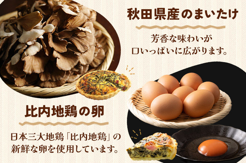 ■原材料:舞茸(秋田県産)、タマネギ、卵(比内地鶏)、小麦粉、生クリーム、ナチュラルチーズ、ベーコン、バター、砂糖、岩塩、コショウ/ベーキングパウダー(一部に卵・乳成分・小麦を含む)