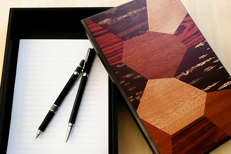 蓋の表面に桜皮(山桜の樹皮)のほか、いろいろな木の突板(木を薄くスライスしたもの)を貼った、自然の温もりあふれるドキュメントケースです。
