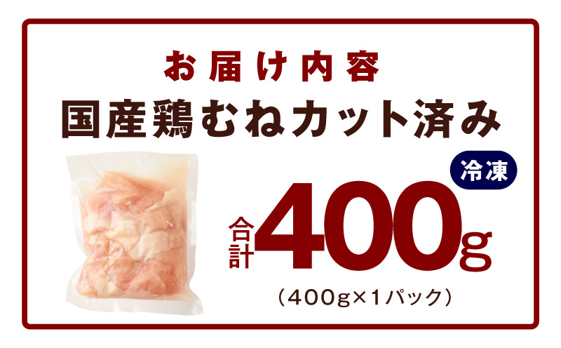 ヘルシーで高たんぱくな鶏ムネ肉を、便利な400gパックにしました。冷凍庫で保管しやすく、必要な分だけ解凍できるので、普段の料理にとても便利です。
