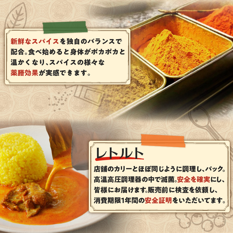 数十種類の新鮮なスパイスを独自のバランスで配合したカリーは食べ始めるとすぐに身体がポカポカと温かくなりはじめ、スパイスのもつ様々な薬膳効果が実感できます。