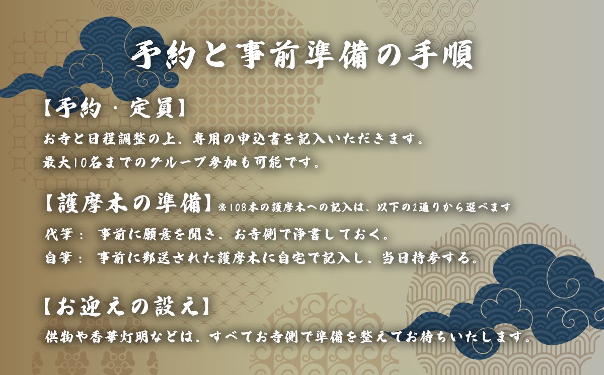 紅冨台寺専用護摩木108 本は事前に願意をお尋ねし当寺にて代筆浄書、又はご自身で記入されたい場合は事前に送付し当日お持ちいただきます。