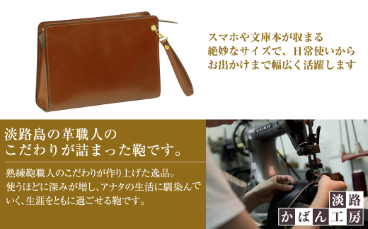 淡路かばん工房の熟練職人が職人が丹念に製作した日本製本革メンズーチ。スマホや文庫本が収まる絶妙なサイズで、日常使いからお出かけまで幅広く活躍します。
