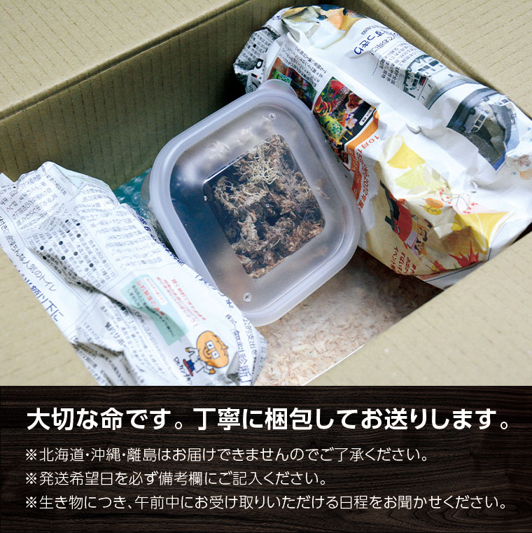 ※細心の注意を払い梱包及び発送をいたしますが、万が一死着の場合は必ず到着当日にご連絡をください。連絡が遅れた場合の対応はできかねますのでご了承ください。