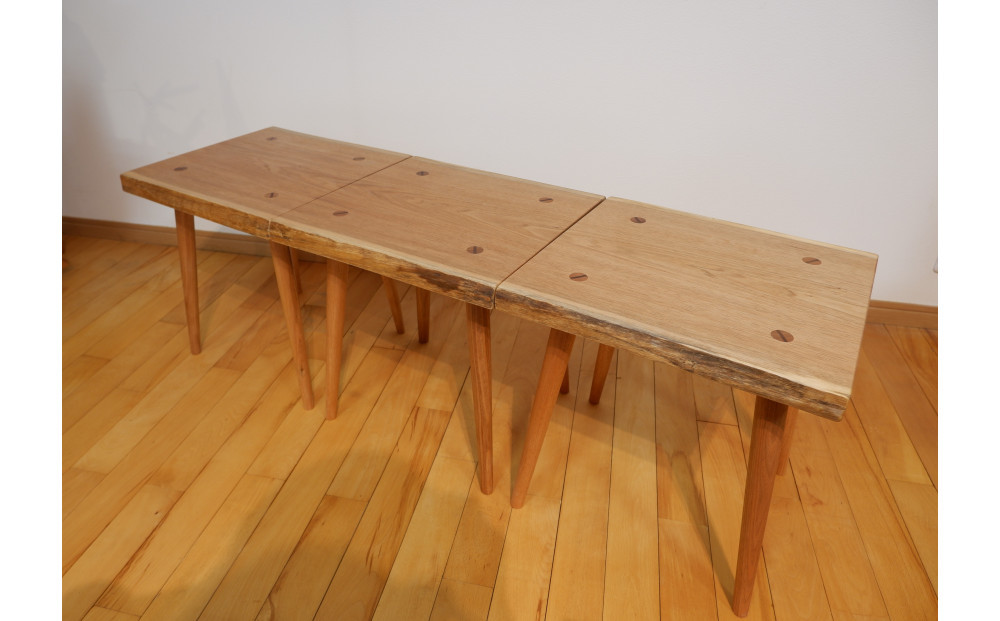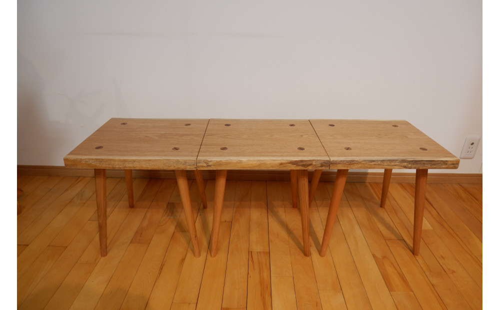 胡桃材の本物の質感と温かみを持ちながら、極めてシンプルかつ実用性に富んだスツール。一枚の板を3分割し製作しているので、木目繋がりでより自然をご体感いただけます。3連使いでベンチとして、単体使用でスツールとして、または置台としても◎