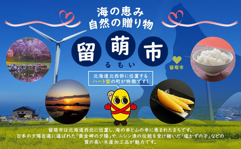また、かつてニシン漁で栄えた伝統を受け継ぎ、日本一の加工生産量を誇る「塩かずの子」などの質の高い水産加工品や、全国食味分析鑑定コンクール連続金賞の「ななつぼし」をはじめとした良質な南るもい米といった、海の幸・山の幸に恵まれています。