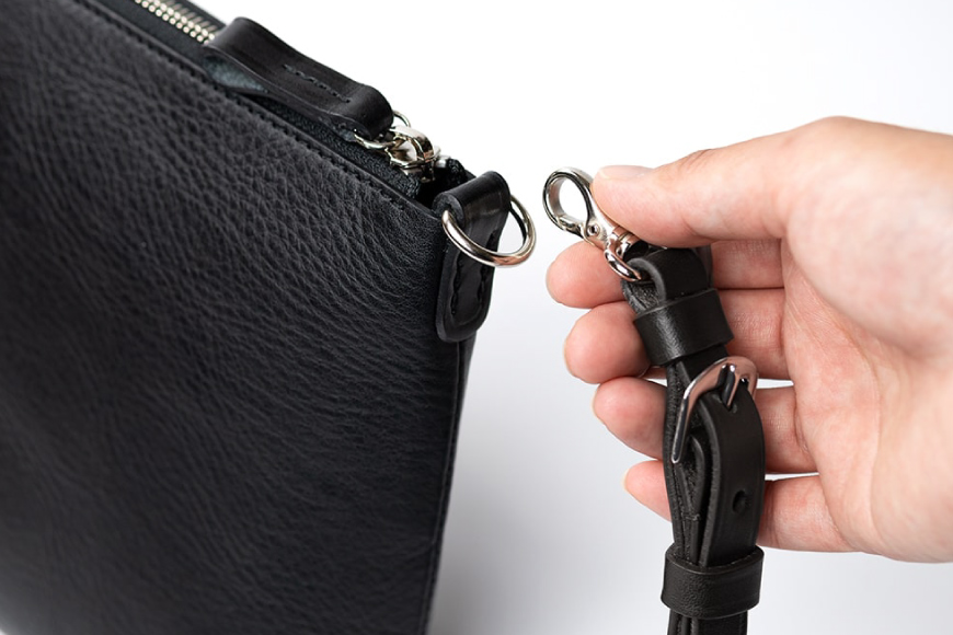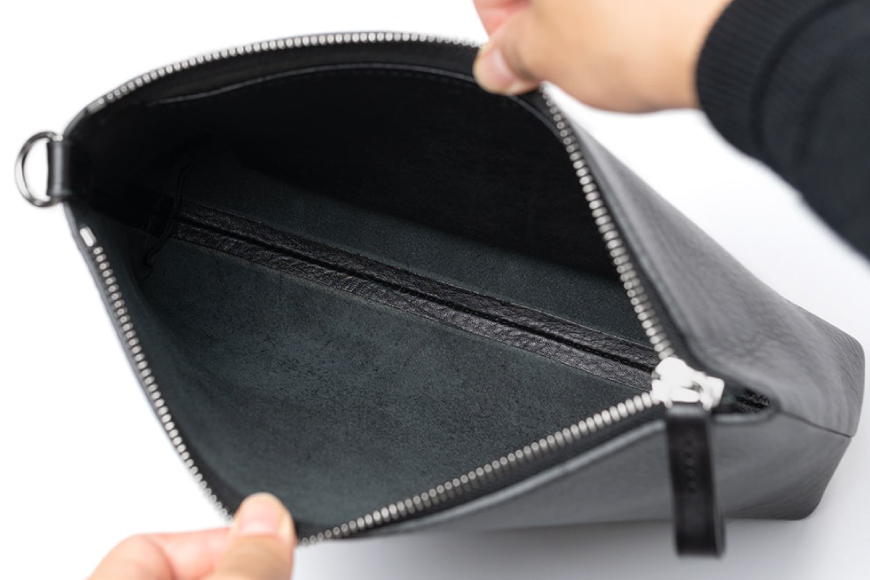 クラッチバッグは長財布やスマホなど、貴重品をコンパクトにまとめられる程よいサイズ感。