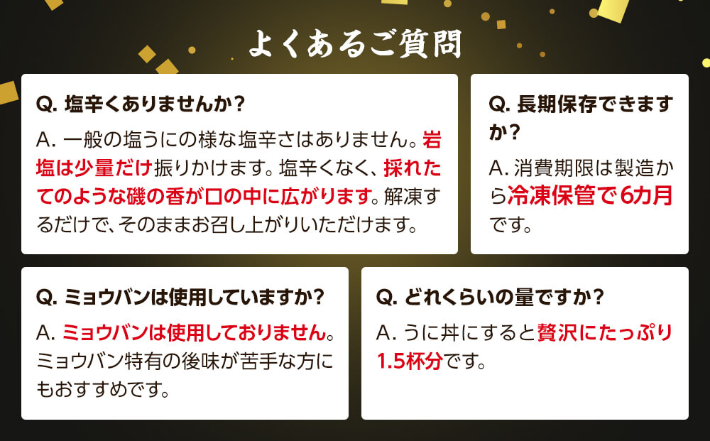 3年間試行錯誤を重ね、うに本来の風味を活かしつつ、冷凍で長期保存させることができました。