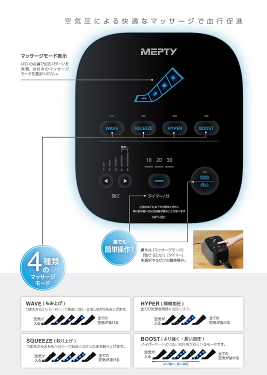 マッサージモード:4種類(ウェーブ・スクイーズ・ハイパー・ブースト)