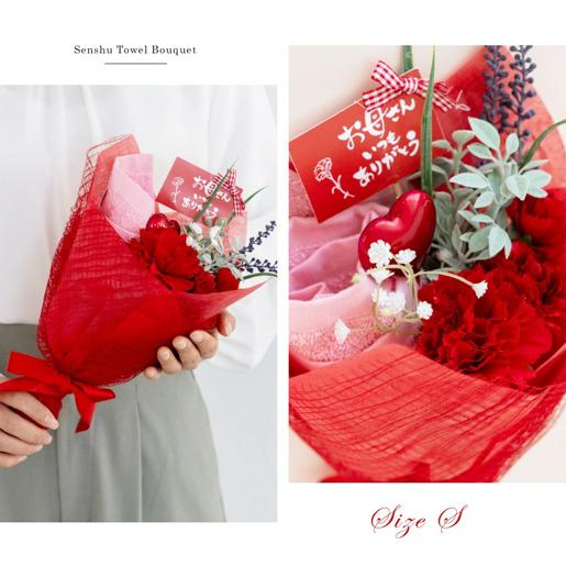 肌触りの良い泉州タオルを使用し、カーネーションやカスミソウ、ラベンダーの厳選した造花を添えています。"お母さんいつもありがとう"のピックを添えて、日頃の感謝の気持ちに寄り添う華やかなアレンジメントです。
