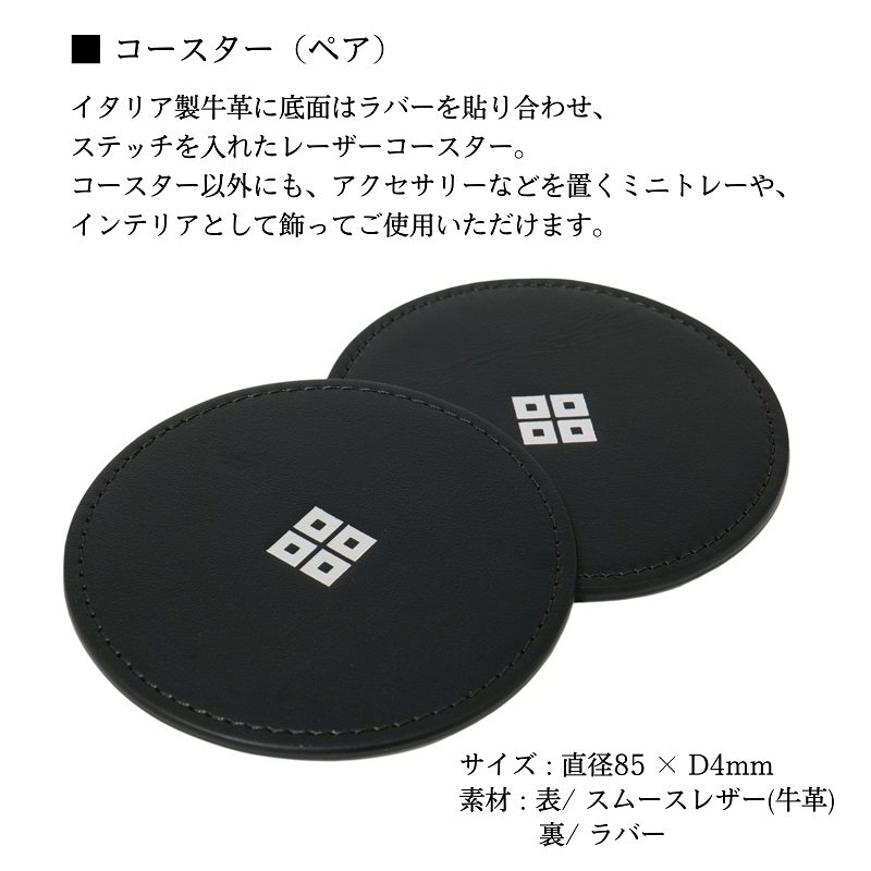 イタリア製牛革に底面はラバーを貼り合わせ、ステッチを入れたレーザーコースター。コースター以外にも、アクセサリーなどを置くミニトレーや、インテリアとして飾ってご使用いただけます。
