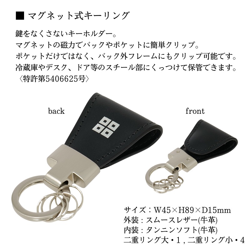 鍵をなくさないキーホルダー。マグネットの磁力でバックやポケットに簡単クリップ。ポケットだけではなく、バック外フレームにもクリップ可能です。冷蔵庫やデスク、ドア等のスチール部にくっつけて保管できます。〈特許第5406625号〉