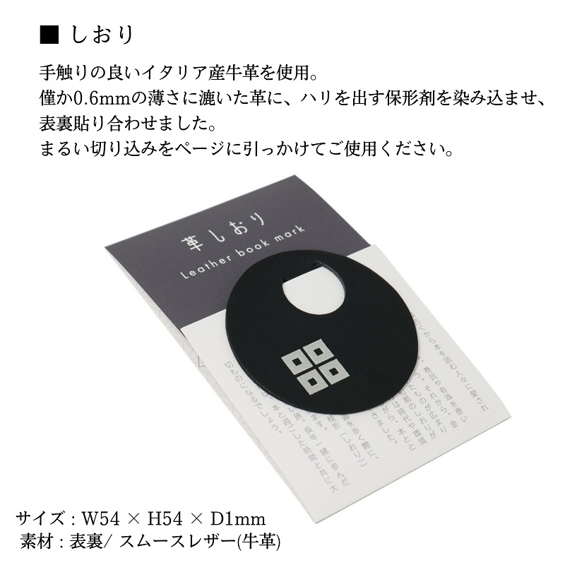 手触りの良いイタリア産牛革を使用。僅か0.6mmの薄さに漉いた革に、ハリを出す保形剤を染み込ませ、表裏貼り合わせました。まるい切り込みをページに引っかけてご使用ください。