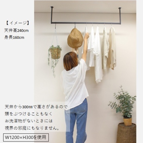 コの字型の天井固定式ハンガーバーです。洗濯物の室内干しや衣類収納に便利です。