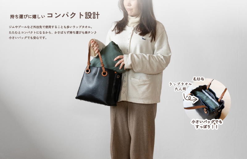 表は通気性の良いガーゼ生地、肌に触れる裏面は吸水性の良いパイル生地のラップタオル。