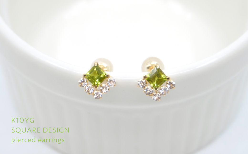 ナチュラルなオリーブグリーンの輝きを放つペリドットのスクエアカットが魅力的です。