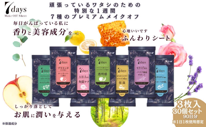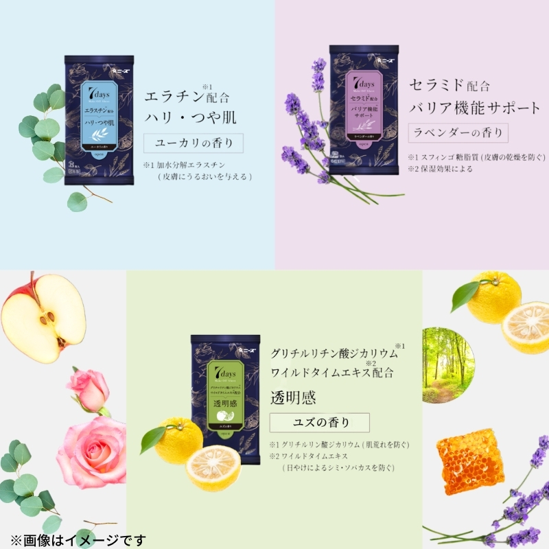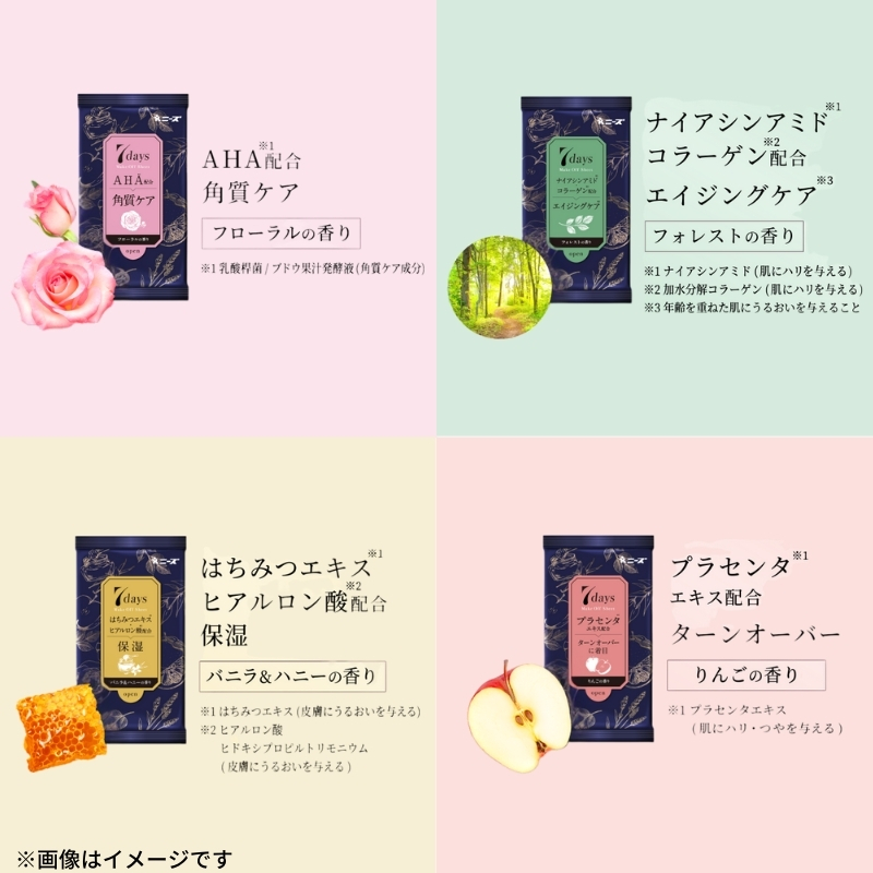 それぞれ7種の香りが楽しめますメイクオフの時間を、いつもより華やかに。今日はどれでメイクオフする?
