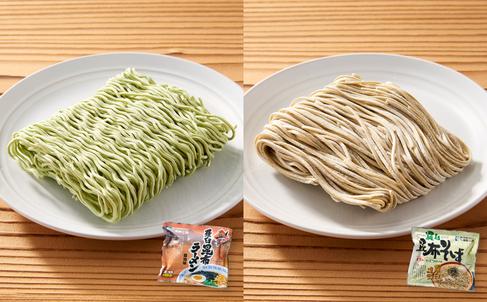 <知床らうすブランド認証品> 麺に羅臼昆布だしを練りこみ、スープにも羅臼昆布だしを使ってあっさりした醤油味に仕上げたラーメン。麺に羅臼昆布の粉末を練りこみ、羅臼昆布だしをつかったつゆを合わせたそば。羅臼昆布尽くしの麺類をセットでお届けします。どちらも知床らうすブランドの認証を受けた自信の品です。