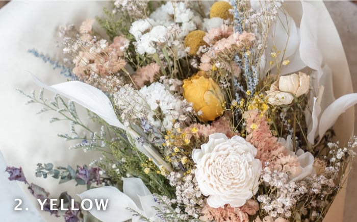 自社乾燥した花独特の色味が強く残り、色持ちの良いドライフラワーを使用しているため、インテリア性が高く、空間にナチュラルに馴染み、その場がパッと映えます。