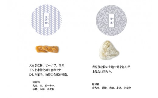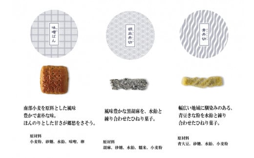 初代は出自である仙台の伝統菓子「仙台駄菓子」と、盛岡広域に伝わる「盛岡駄菓子」を参考とし、先代が永年の伝統技術の手法に独自の創意をほどこしてきた「紫波駄菓子」。