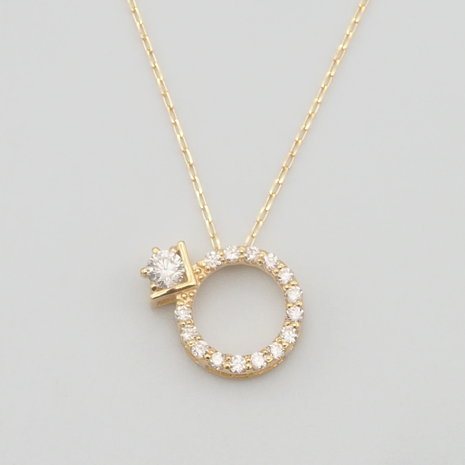 指輪の形をしたキュートなフォルムで胸元で輝き、カジュアルに着けれるアイテム。
