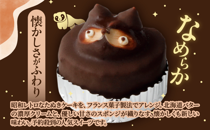 上質なクーベルチュールチョコレートを使い、中身はフランス菓子の製法で作ったイタリアンメレンゲを加えたフランス風バタークリームにきめの細かいスポンジでロールケーキを巻いてたぬきケーキを作り現代風にアレンジしています。