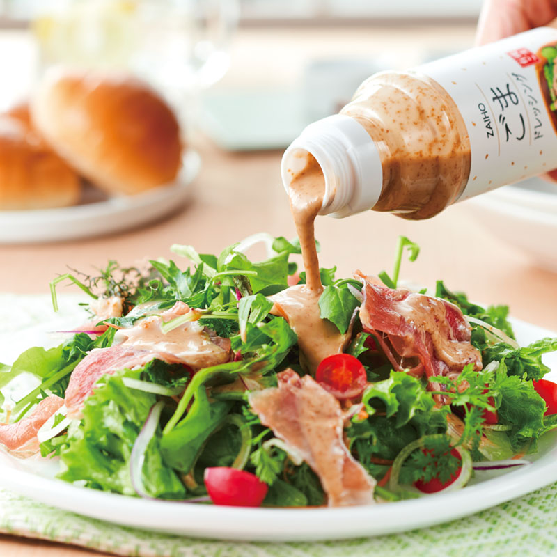 ごまドレッシングは有機栽培のごまを使用した、濃厚なごまの香りが特徴のドレッシングです。サラダにはもちろん、しゃぶしゃぶのつけだれや、ソースへのアレンジなど幅広くご利用いただける調味料です。