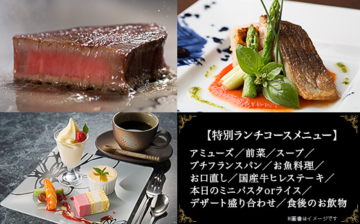 【特別ランチコースメニュー】アミューズ/前菜/スープ/プチフランスパン/お魚料理/お口直し/国産牛ヒレステーキ/本日のミニパスタorライス/デザート盛り合わせ/食後のお飲物